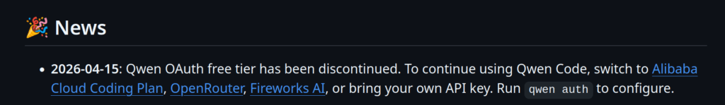 2026-04-15: Qwen OAuth free tier has been discontinued. To continue using Qwen Code, switch to Alibaba Cloud Coding Plan, OpenRouter, Fireworks AI, or bring your own API key. Run qwen auth to configure.